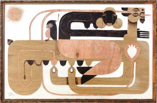 Holzschnitt, Holzbrand, Acryl, Lack auf Holz